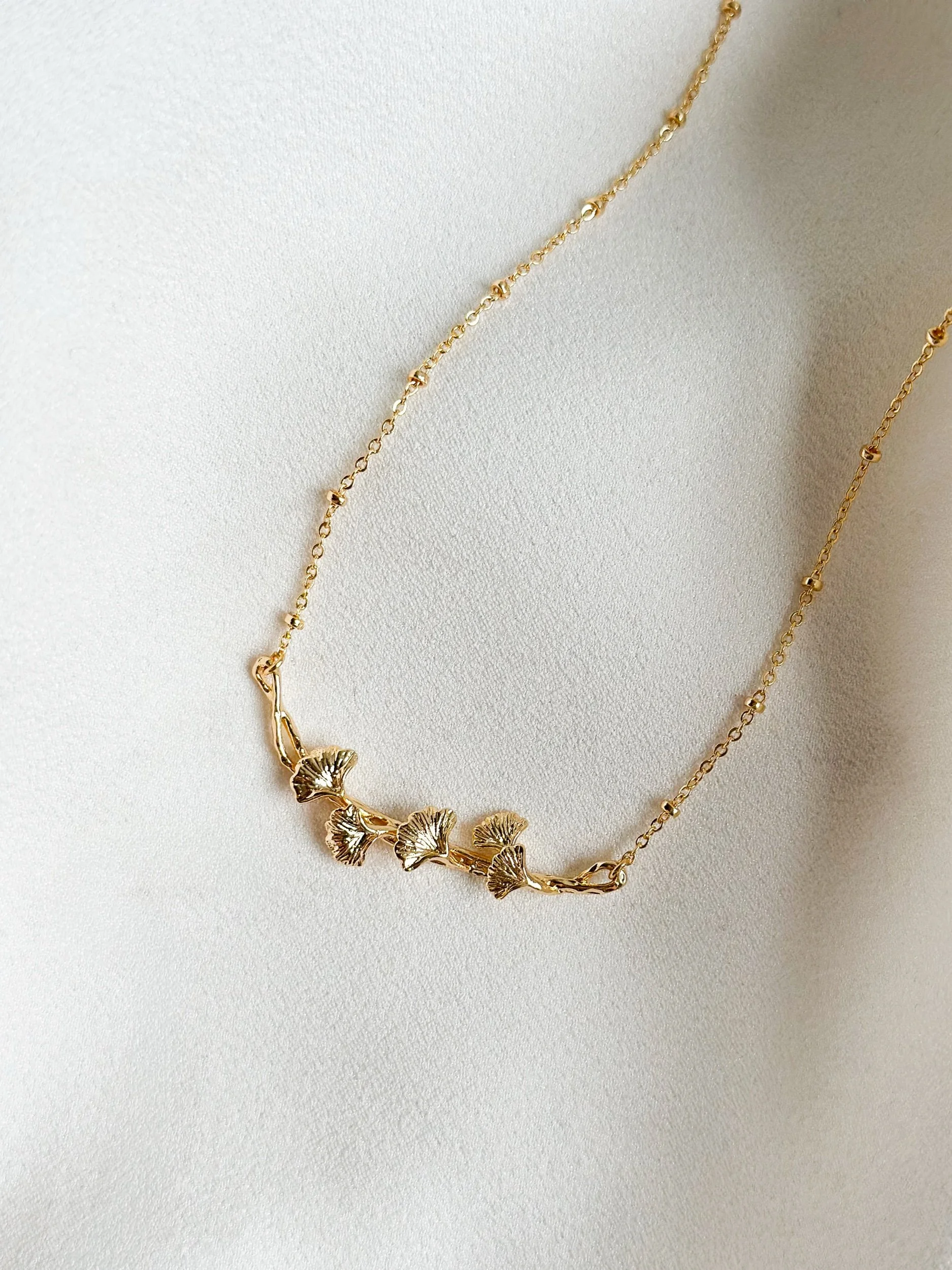 Shop › Gingko Vine 18k Gold Necklace Gingko Vine 18k Gold Necklace £26.00 18m gold plated necklace set on a satellite chain. Detailed vine with gingko leaf design. Approx 18inch +2inch extension 18m gold plated necklace set on a satellite chain. Detailed vine with gingko leaf design. Approx 18inch +2inch extension Add To Cart Added!